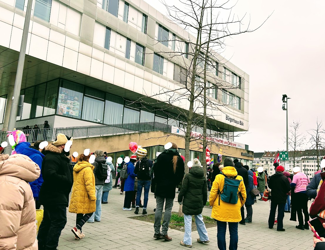 Bunte Republik für Demokratie, Vielfalt und Toleranz wollen wir nicht nur an diesem Karnevalswochenende. Einige Tausend Teilnehmer*innen sind heute auf den Platz vor den Bilker Arkaden in Düsseldorf gekommen, um dafür zu demonstrieren, dass das auch so bleibt in Deutschland. Wir wollen nicht, dass unser Grundgesetz mit Artikel 1 „Die Würde des Menschen ist unantastbar“ in irgendeiner Form in Frage gestellt oder gar aufgehöhlt wird.