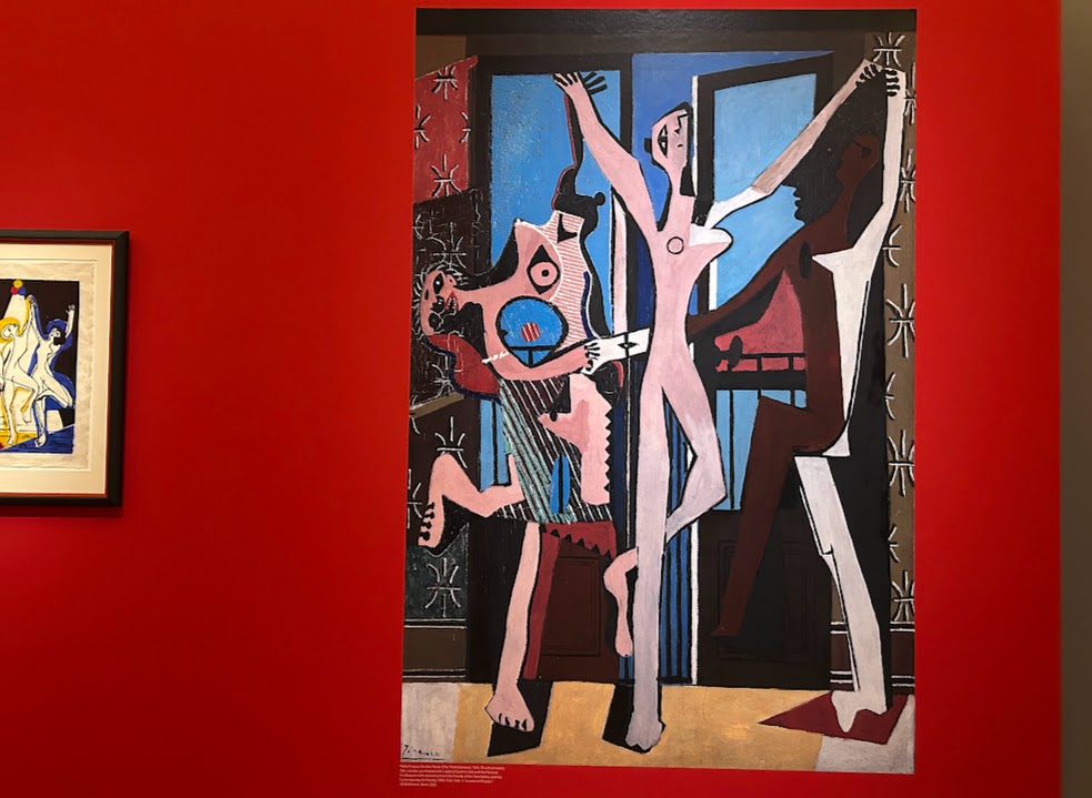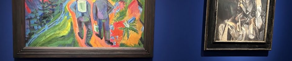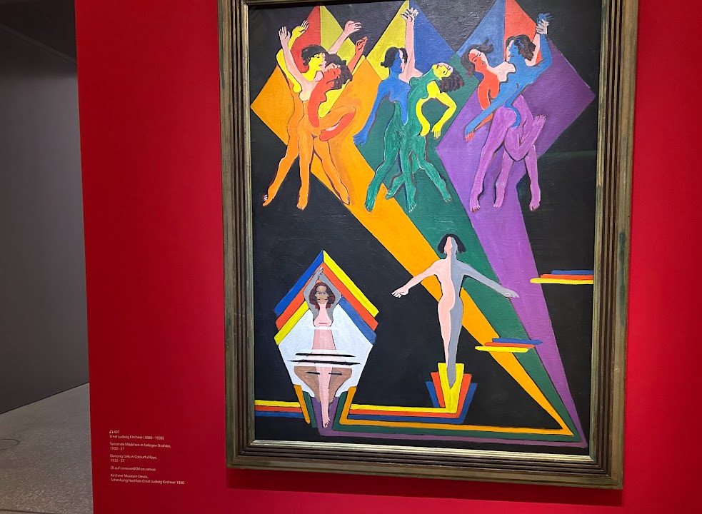 Die Kuratoren haben erstaunliche Parallelen dieser beiden Zeitzeugen der Zeit vor und nach dem ersten Weltkrieg herausgearbeitet, sowohl in der Wahl von Motiven, als auch in der Art der Durchführung. Wir sehen und vergleichen Werke von Kirchner und Picasso gegenüber- und nebeneinandergestellt, wie Kirchners „Tanzende Mädchen in farbigen Strahlen“ und Picassos „Die drei Tänzer“.