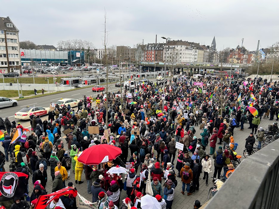 Damit sind 40 % der Stimmen gesichert. Und für die fehlenden 60 % demonstrieren wir gerade, in diesem Falle für das Votum des Landes NRW. Das machen wir so lange, bis wir unser Ziel erreicht haben für ein Deutschland ohne Rassismus, Remigration, Missachtung der Menschenrechte, für ein friedliches Miteinander mit Demokratie, Vielfalt, Toleranz, ein buntes Deutschland und ein buntes Europa.