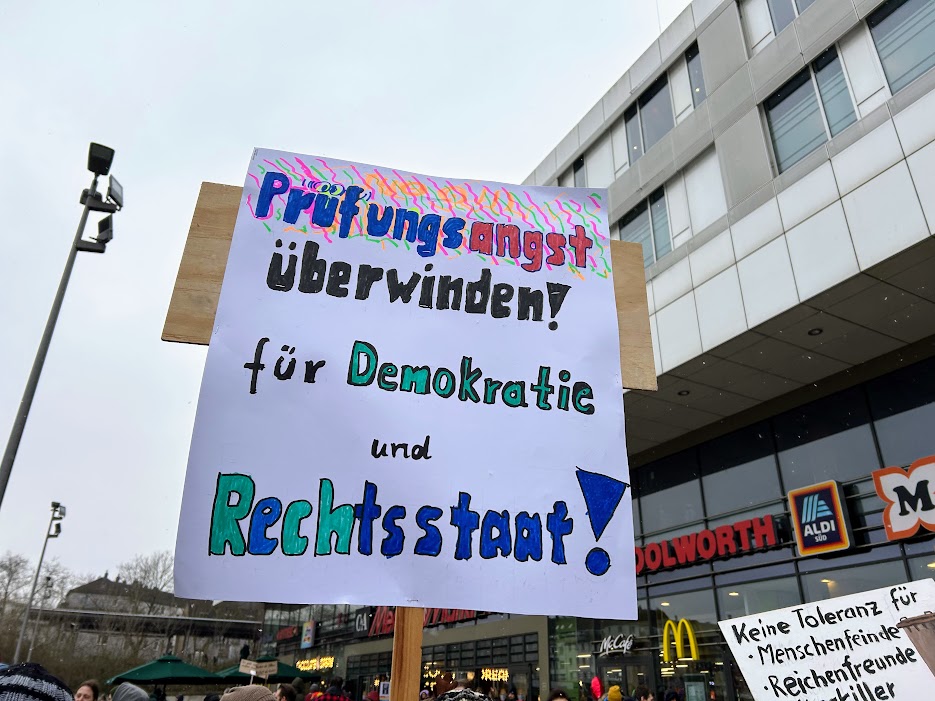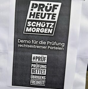 Und zurzeit vor allem für die Prüfung. Prüfung? Ja, Prüfung! Kurz Prüf! Mit diesem Gedanken hat Nico Semsrott vor einigen Monaten viele Menschen überzeugt nach dem Motto: „Wir demonstrieren in allen Landeshauptstädten so lange, bis der Bundesrat beim Bundesverfassungsgericht die Überprüfung aller vom Verfassungsschutz als rechtsextremer Verdachtsfall oder gesichert rechtsextrem eingestuften Parteien beantragt hat.“ Inzwischen gibt es Prüf Demos in Hamburg, Berlin, München, Stuttgart und hier in Düsseldorf.