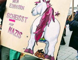 Wie das aussähe, hatten wir ja in den Jahren 1933 bis 1945 mit all den schrecklichen Folgen, unter denen viele Menschen und viele Familien in Deutschland, Europa und der ganzen Welt noch heute leiden. Nie wieder! Nie wieder ist jetzt, in diesem Moment auf diesem Platz in Düsseldorf Bilk. Alle hier sind sich da einig, haben ihre Messages auf Schildern und Plakaten mitgebracht zur Tanzdemo für Grundrechte, Menschenrechte, Asylrechte, für Demokratie und Rechtsstaat.